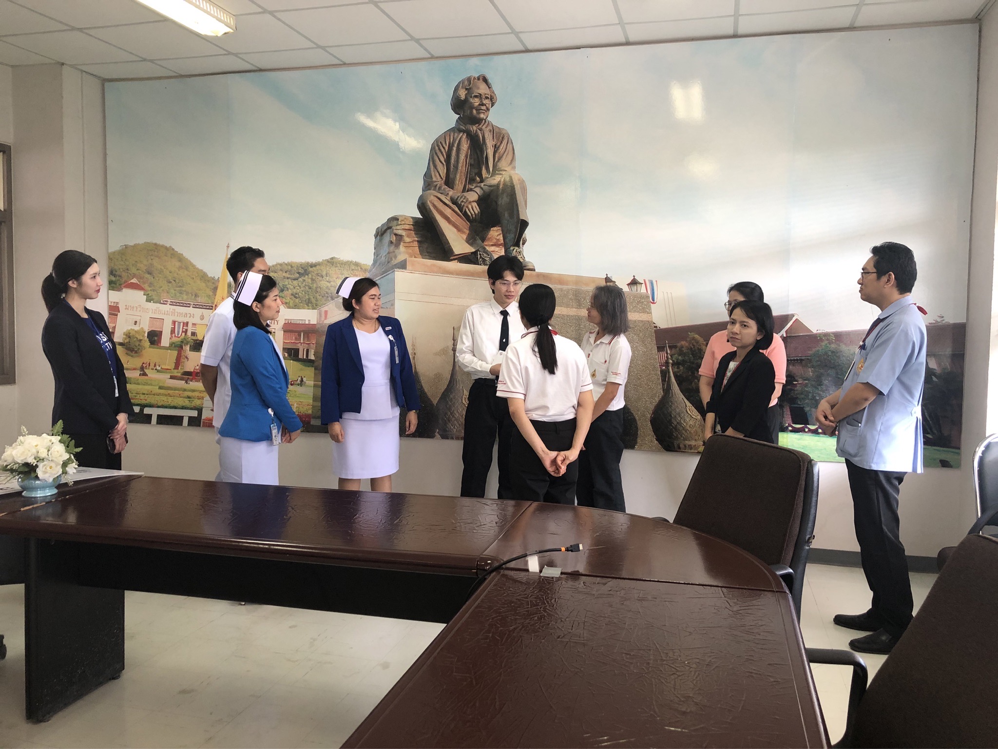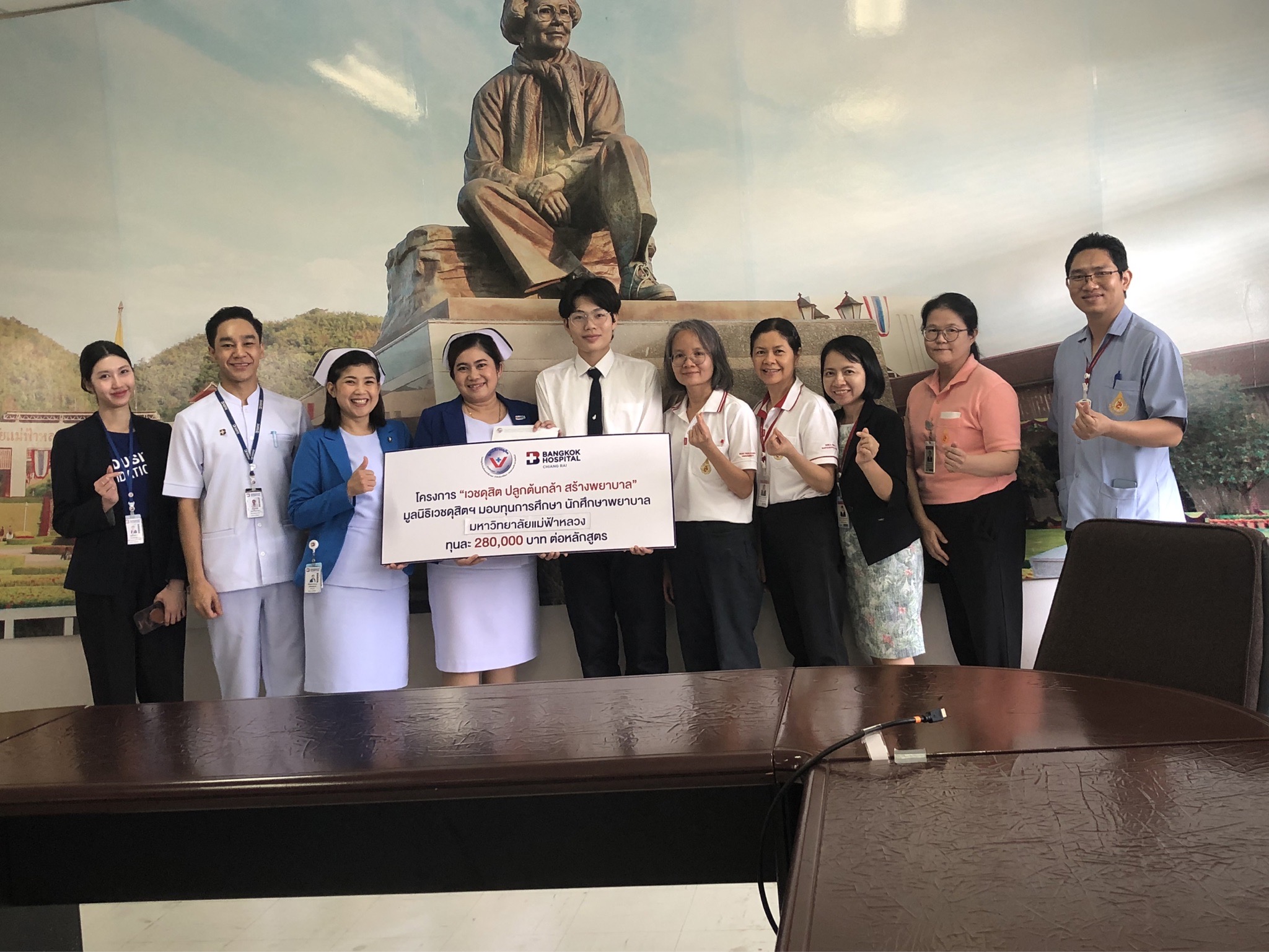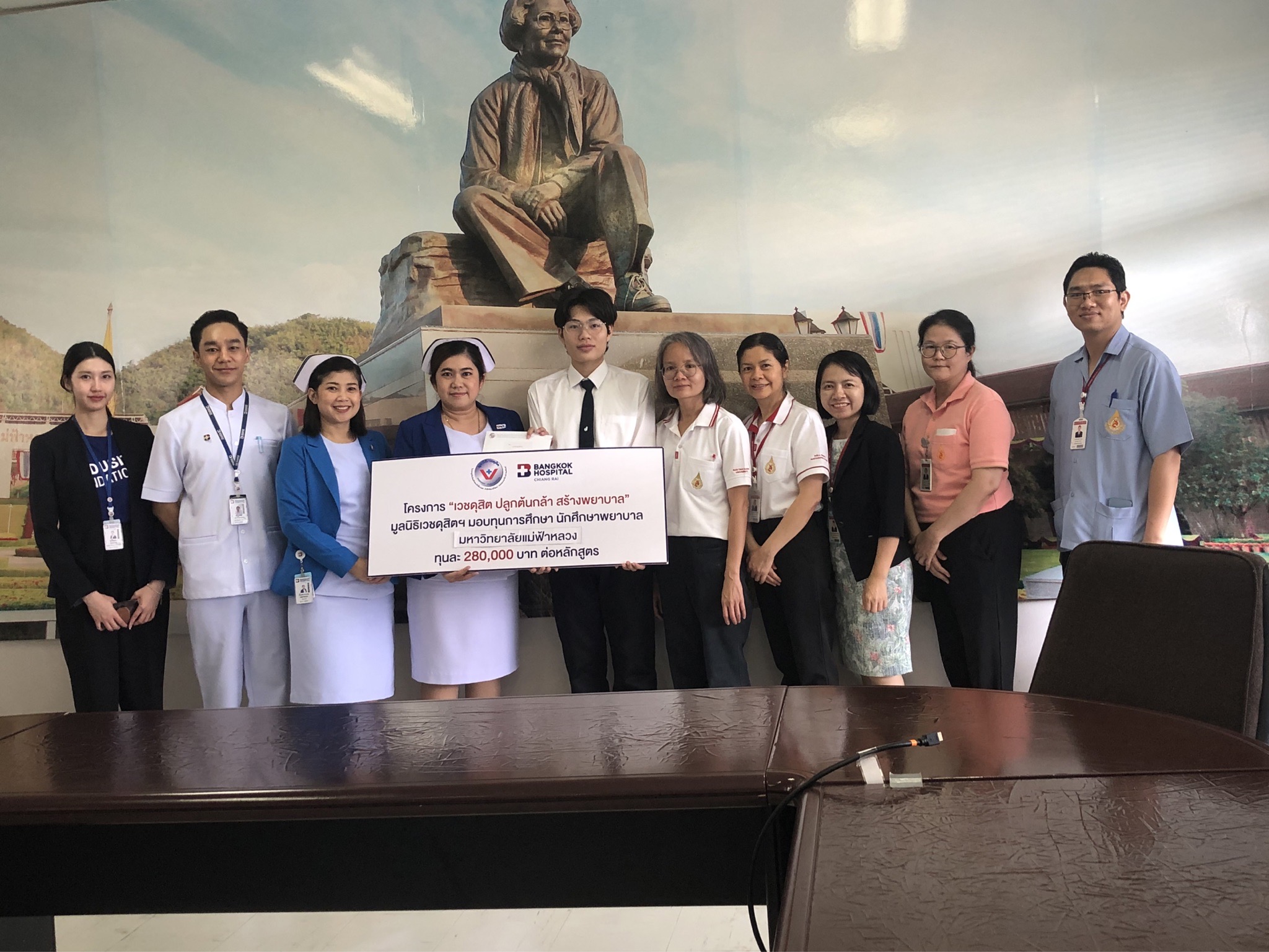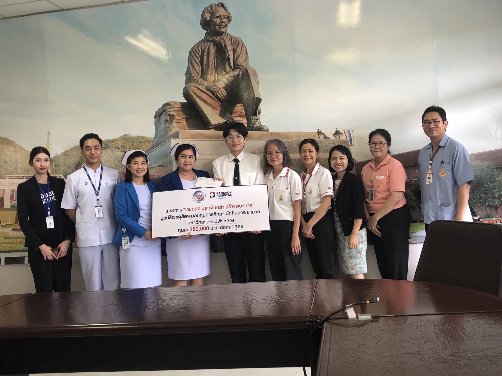 On October 21, 2025, Assistant Professor Dr. Katemanee Moonpanane, Assistant Dean of the School of Nursing, Mae Fah Luang University, welcomed a delegation from Bangkok Hospital Chiang Rai, representing the Vejdusit Foundation under the patronage of Her Royal Highness Princess Galyani Vadhana, the Princess Royal, to present scholarships under the "Vejdusit Nurturing Future Nurses" project. The scholarships were awarded to outstanding nursing students who lack financial resources.