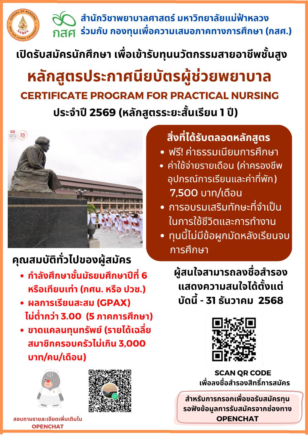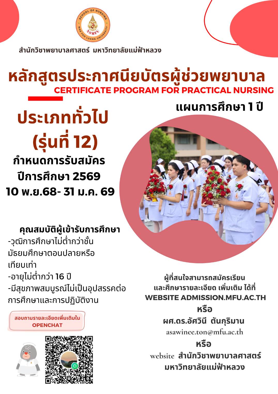รับสมัครบุคคลเข้าศึกษาหลักสูตรประกาศนียบัตรผู้ช่วยพยาบาล (หลักสูตร 1 ปี) ปีการศึกษา 2569/Admission Announcement for Certificate Program for Practical Nursing (1-Year Program)
