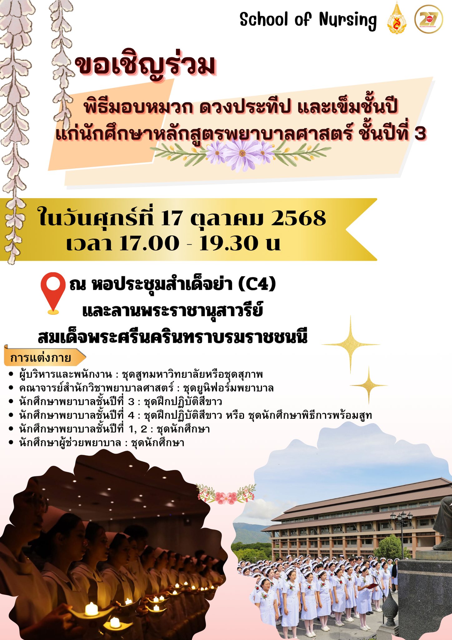 สำนักวิชาพยาบาลศาสตร์ มหาวิทยาลัยแม่ฟ้าหลวง ขอเชิญร่วมพิธีมอบหมวก ดวงประทีป และเข็มชั้นปี แก่นักศึกษาหลักสูตรพยาบาลศาสตร์ ชั้นปีที่ 3