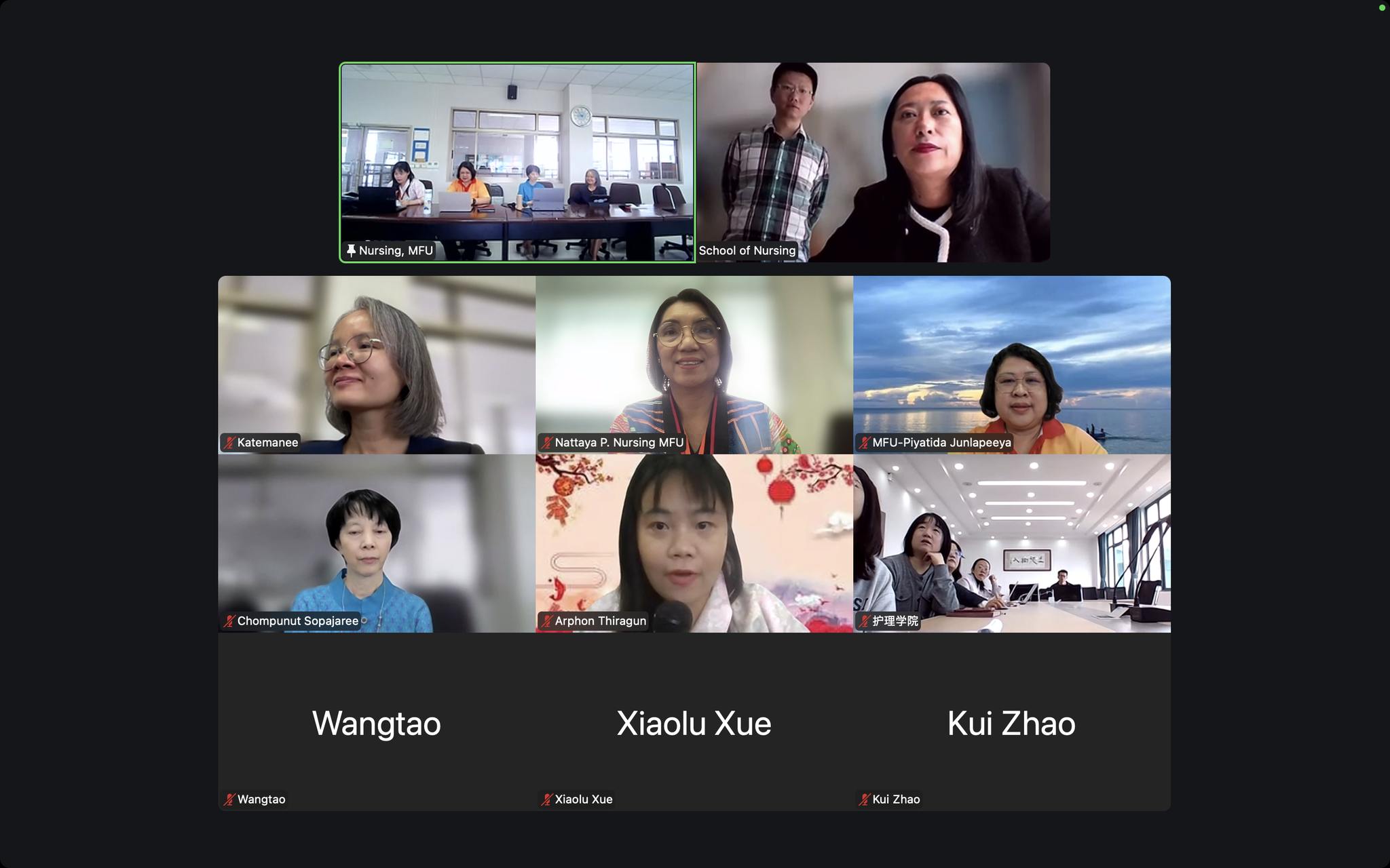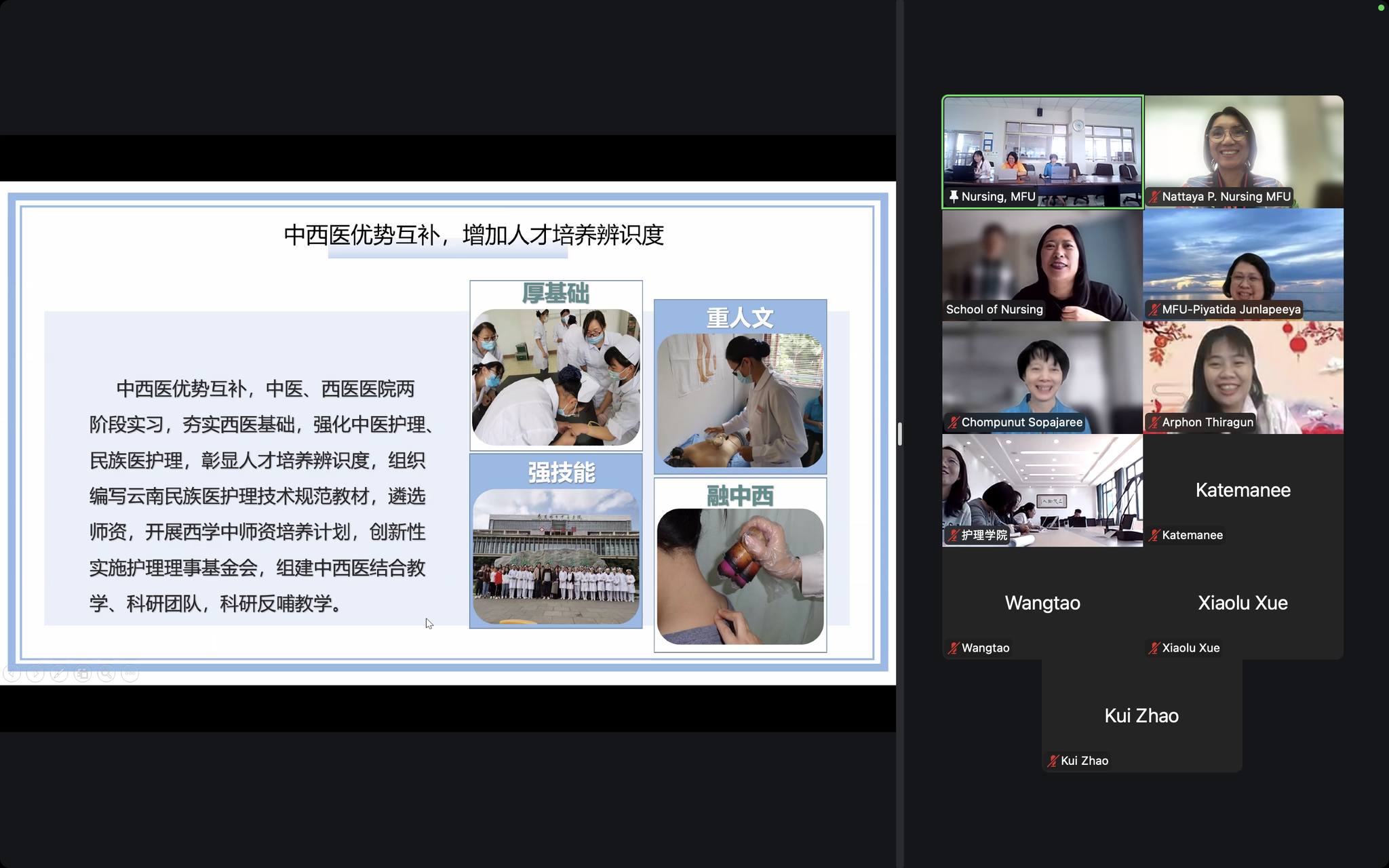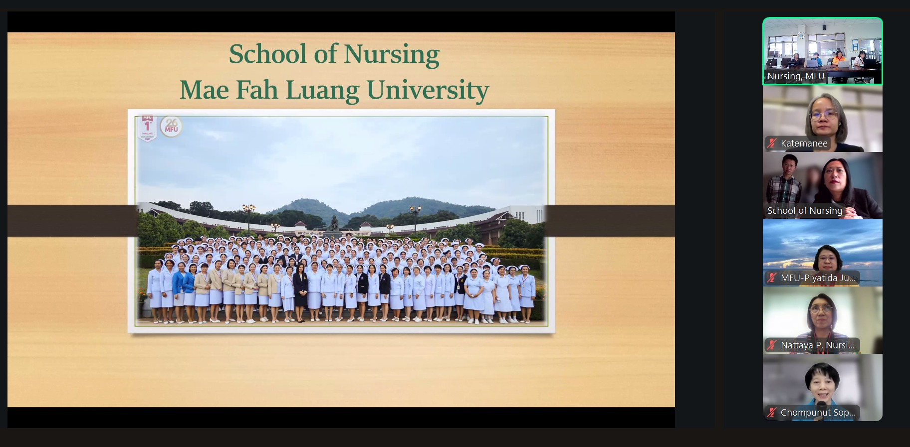 On October 24, 2025, the School of Nursing, Mae Fah Luang University (MFU), led by Assistant Professor Dr. Chompunut Sopajaree, Dean, along with Assistant Professor. Prof. Dr. Katemanee Moonpanane, Dr. Piyatida Junlapeeya, Chair of the Internationalization Promotion Committee and Dr. Arporn Thiragun from the School of Sinology, who served as the Chinese interpreter, attended an online meeting with the School of Nursing at Yunnan University of Chinese Medicine (YUCM), China. The YUCM team was led by Professor Ruifen Sun, Dean of the School of Nursing.