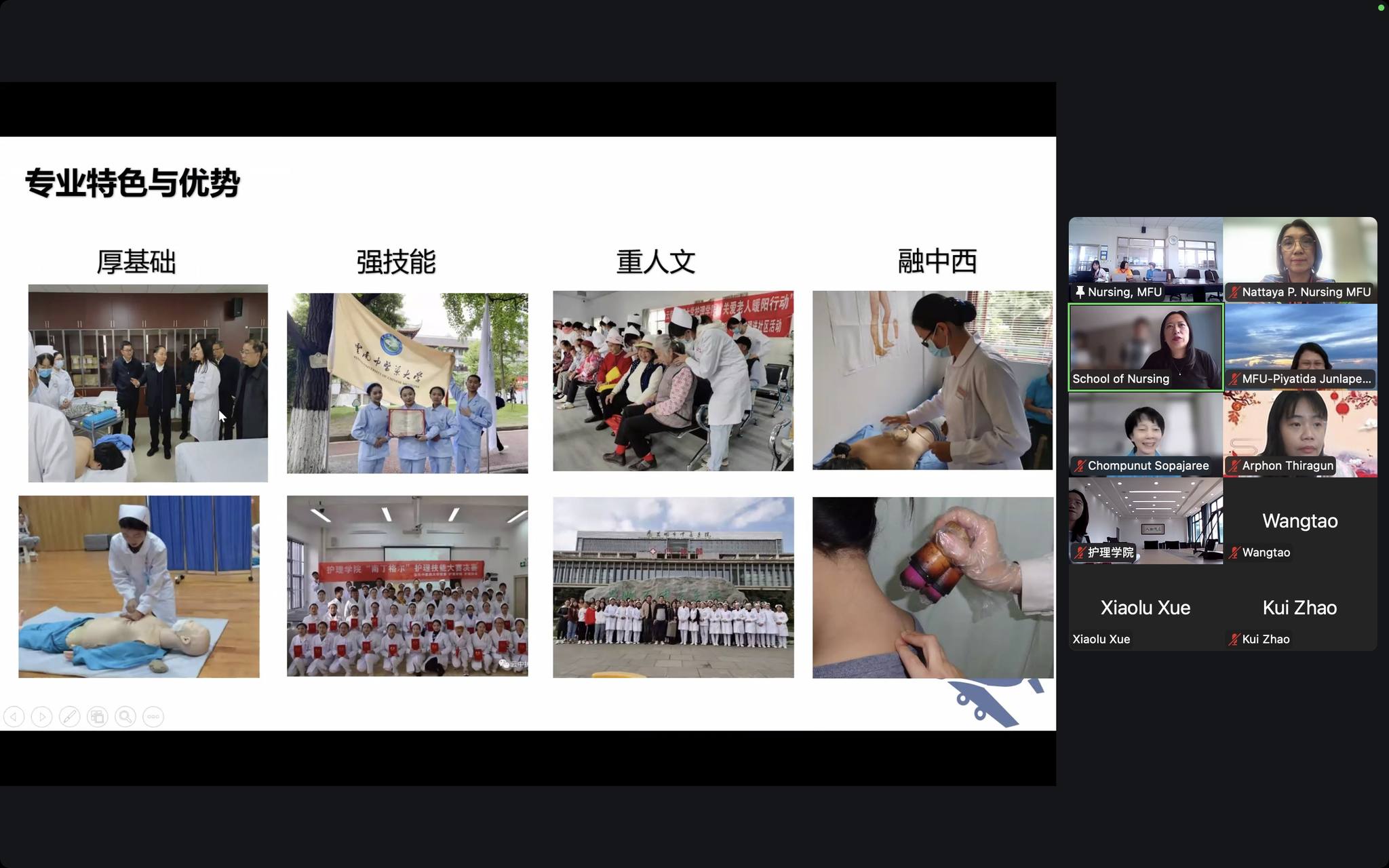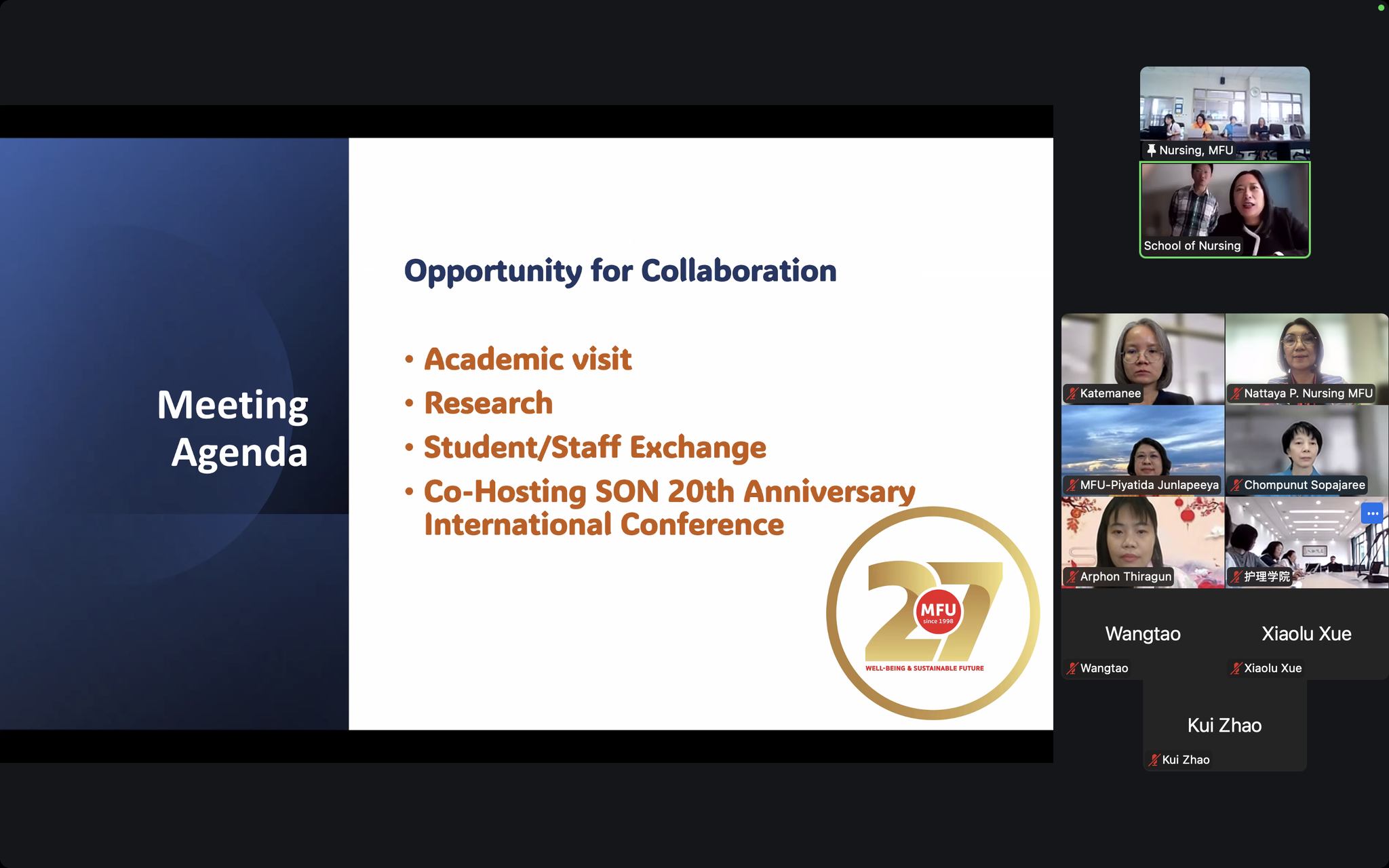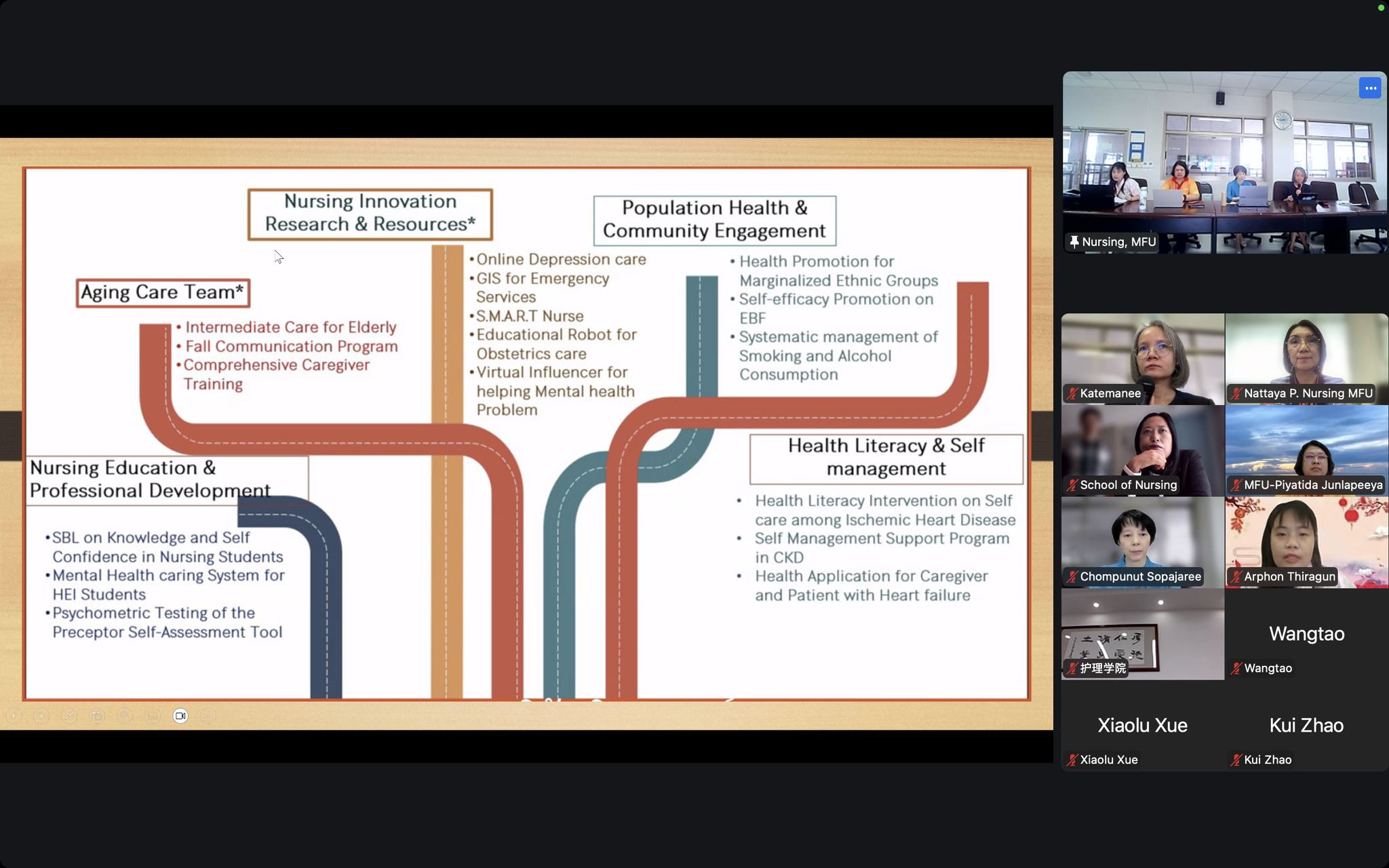 On October 24, 2025, the School of Nursing, Mae Fah Luang University (MFU), led by Assistant Professor Dr. Chompunut Sopajaree, Dean, along with Assistant Professor. Prof. Dr. Katemanee Moonpanane, Dr. Piyatida Junlapeeya, Chair of the Internationalization Promotion Committee and Dr. Arporn Thiragun from the School of Sinology, who served as the Chinese interpreter, attended an online meeting with the School of Nursing at Yunnan University of Chinese Medicine (YUCM), China. The YUCM team was led by Professor Ruifen Sun, Dean of the School of Nursing.