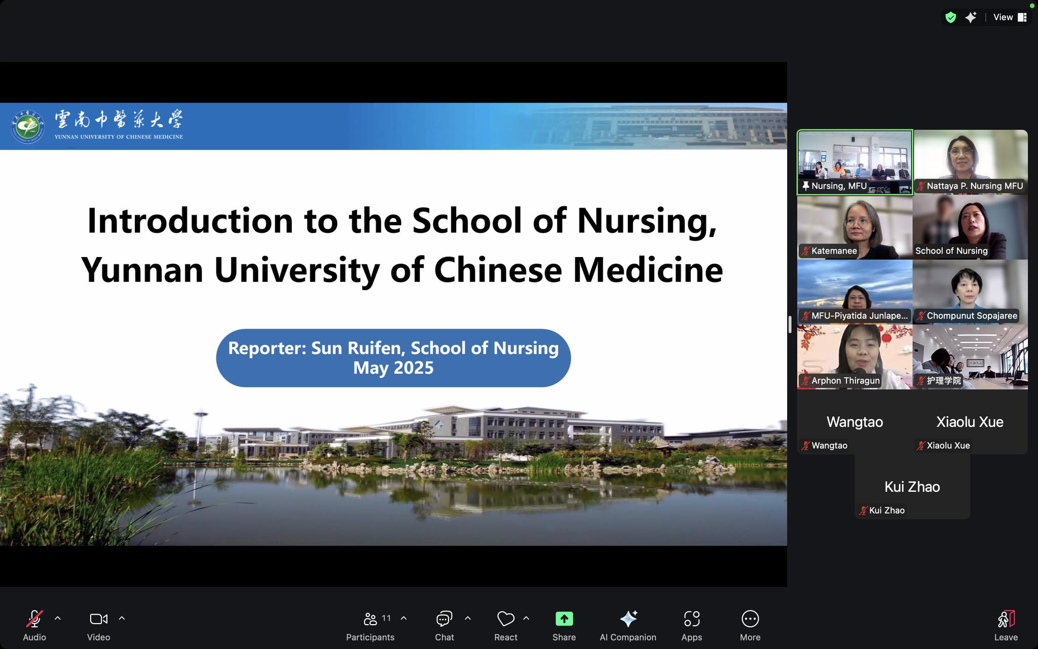 วันที่ 24 ตุลาคม 2568 สำนักวิชาพยาบาลศาสตร์ มหาวิทยาลัยแม่ฟ้าหลวง นำโดย ผู้ช่วยศาสตราจารย์ ดร.ชมพูนุช โสภาจารีย์ คณบดี พร้อมด้วย ผู้ช่วยศาสตราจารย์ ดร.เกศมณี มูลปานันท์, อาจารย์ ดร.ปิยธิดา จุลละปีย ประธานคณะกรรมการส่งเสริมความเป็นนานาชาติ และ ดร. อาภรณ์ ถิรกันต์  อาจารย์ จากสำนักวิชาจีนวิทยา มหาวิทยาลัยแม่ฟ้าหลวง ซึ่งทำหน้าที่ผู้แปลภาษาจีน ได้เข้าร่วมการประชุมผ่านสื่อออนไลน์กับ School of Nursing, Yunnan University of Chinese Medicine (YUCM) ประเทศจีน โดยมี Professor Ruifen Sun, คณบดี School of Nursing, YUCM และคณะผู้บริหารเข้าร่วมการประชุม