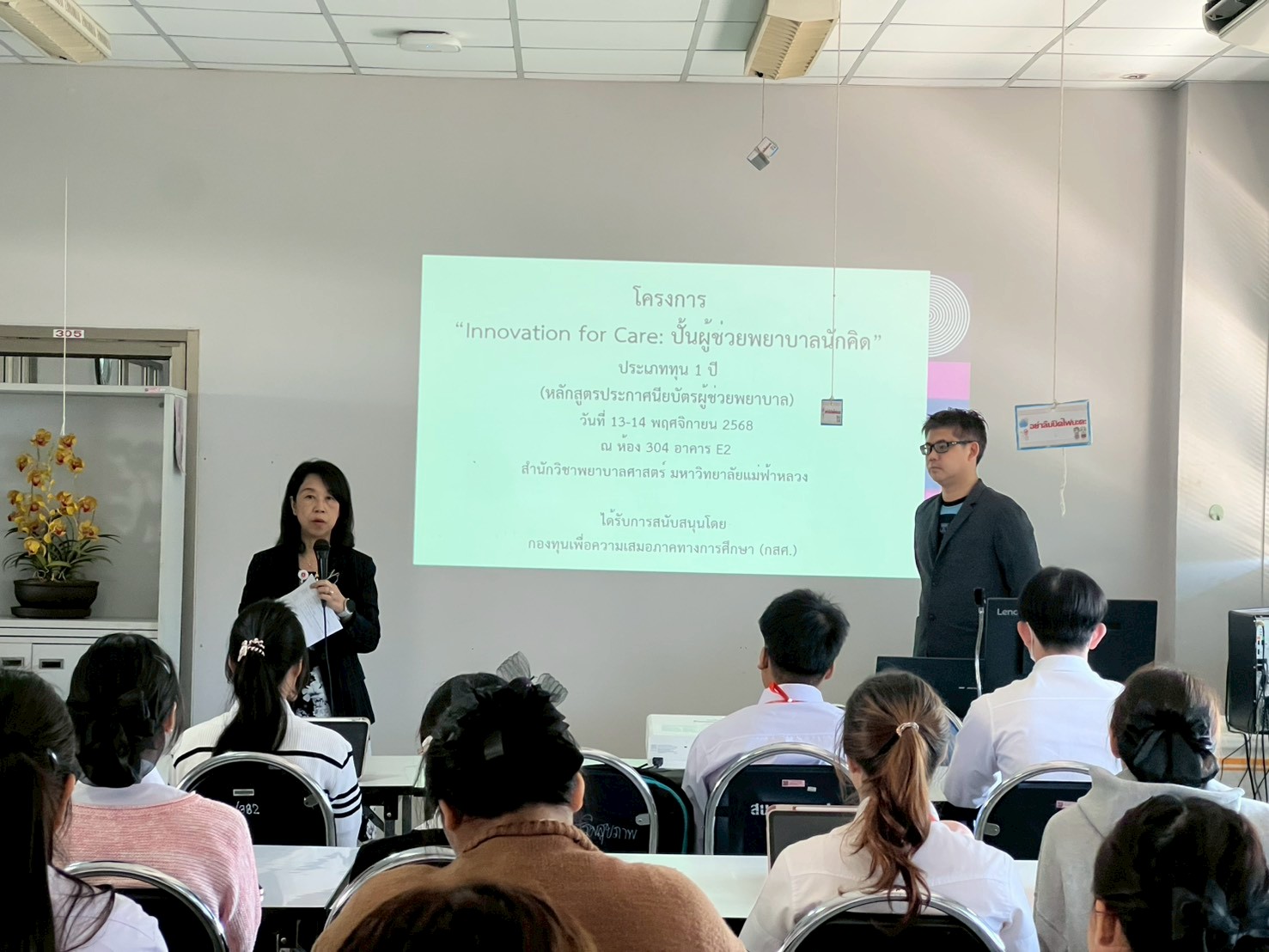 วันที่ 13-14 พฤศจิกายน 2568 คณะกรรมการดำเนินงานบริหารหลักสูตรประกาศนียบัตรผู้ช่วยพยาบาล สำนักวิชาพยาบาลศาสตร์ มหาวิทยาลัยแม่ฟ้าหลวง จัดโครงการ “Innovation for Care: ปั้นผู้ช่วยพยาบาลนักคิด” ณ อาคาร E2 ห้อง 304 ให้แก่นักศึกษาหลักสูตรประกาศนียบัตรผู้ช่วยพยาบาลที่ได้รับทุนการศึกษาจาก กองทุนเพื่อความเสมอภาคทางการศึกษา (กศส.)