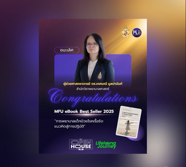 1. รางวัล MFU eBook Best Seller 2025 ซึ่งเป็นผลงานที่มียอดจำหน่ายสูงที่สุด 4 อันดับ ภายใต้โครงการทุนสนับสนุนการจัดทำตำราและหนังสือ มหาวิทยาลัยแม่ฟ้าหลวง ผู้ได้รับรางวัลได้แก่