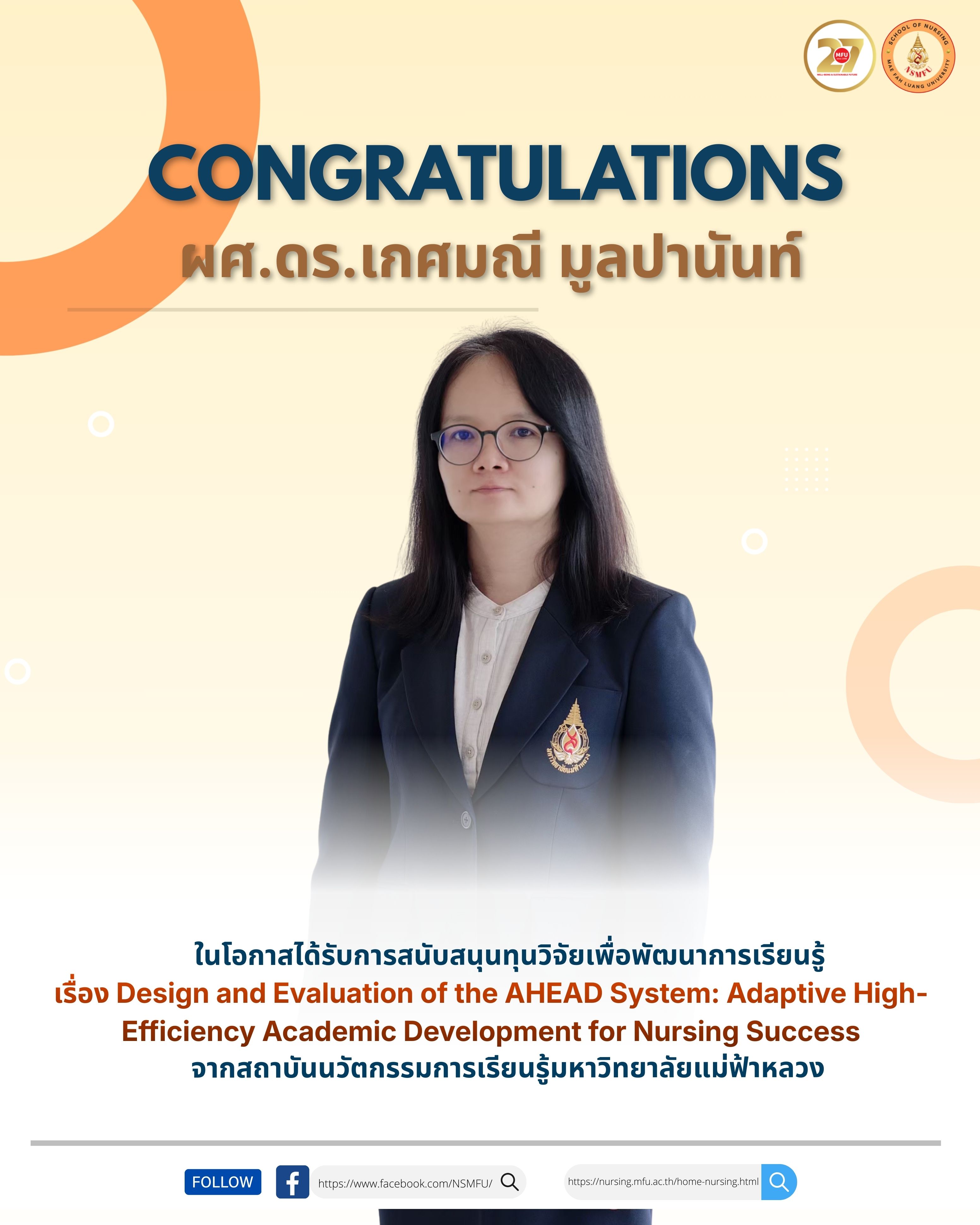 The School of Nursing, Mae Fah Luang University, would like to congratulate the following faculty members who have received research funding to enhance learning from the Mae Fah Luang University Institute of Learning Innovation for the year 2025: