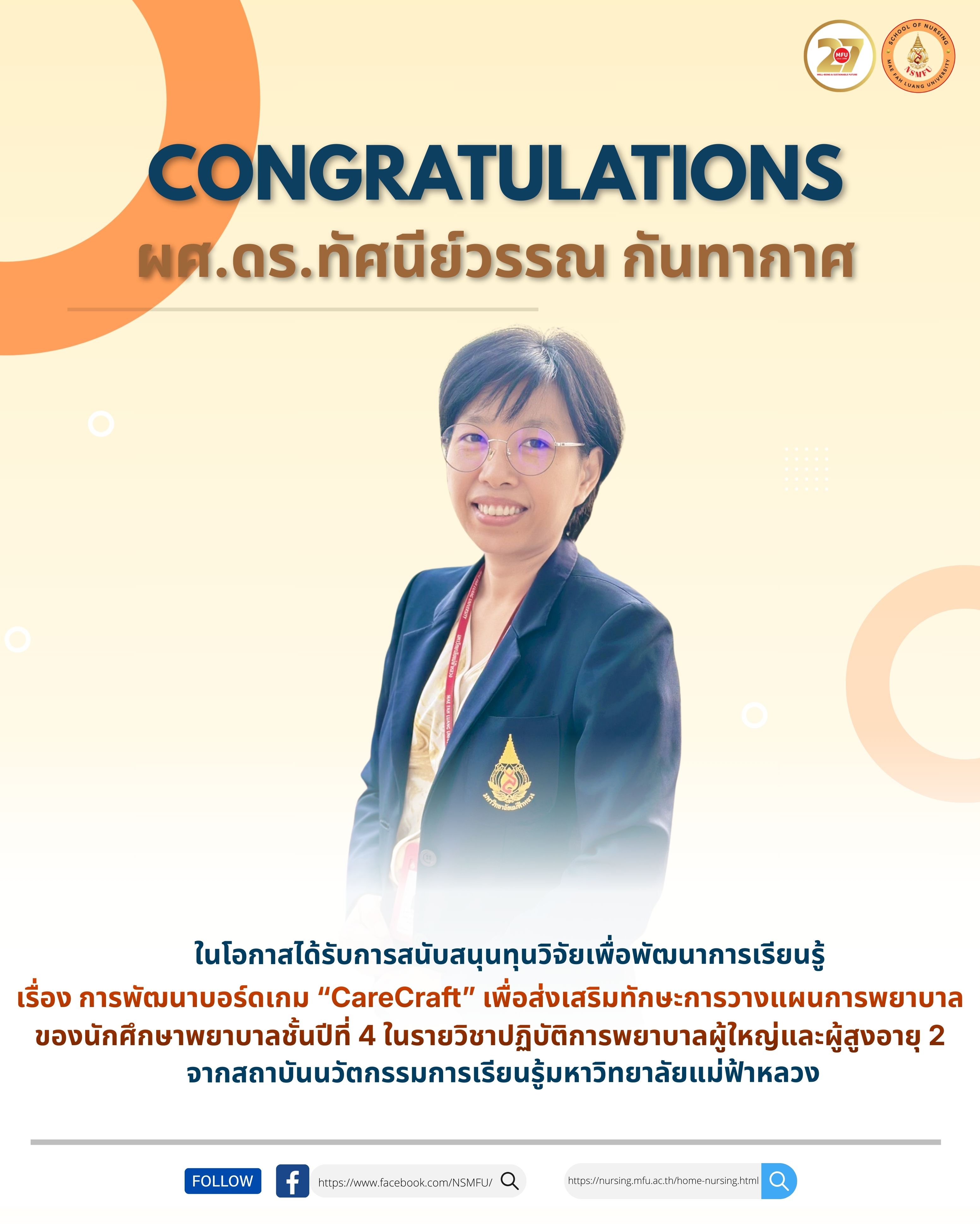 Asst. Prof. Dr. Tadsaneewan Gantagad – Research project titled "Development of the 'CareCraft' Board Game to Enhance Nursing Care Planning Skills for 4th-Year Nursing Students in the Adult and Geriatric Nursing Practice Course 2"