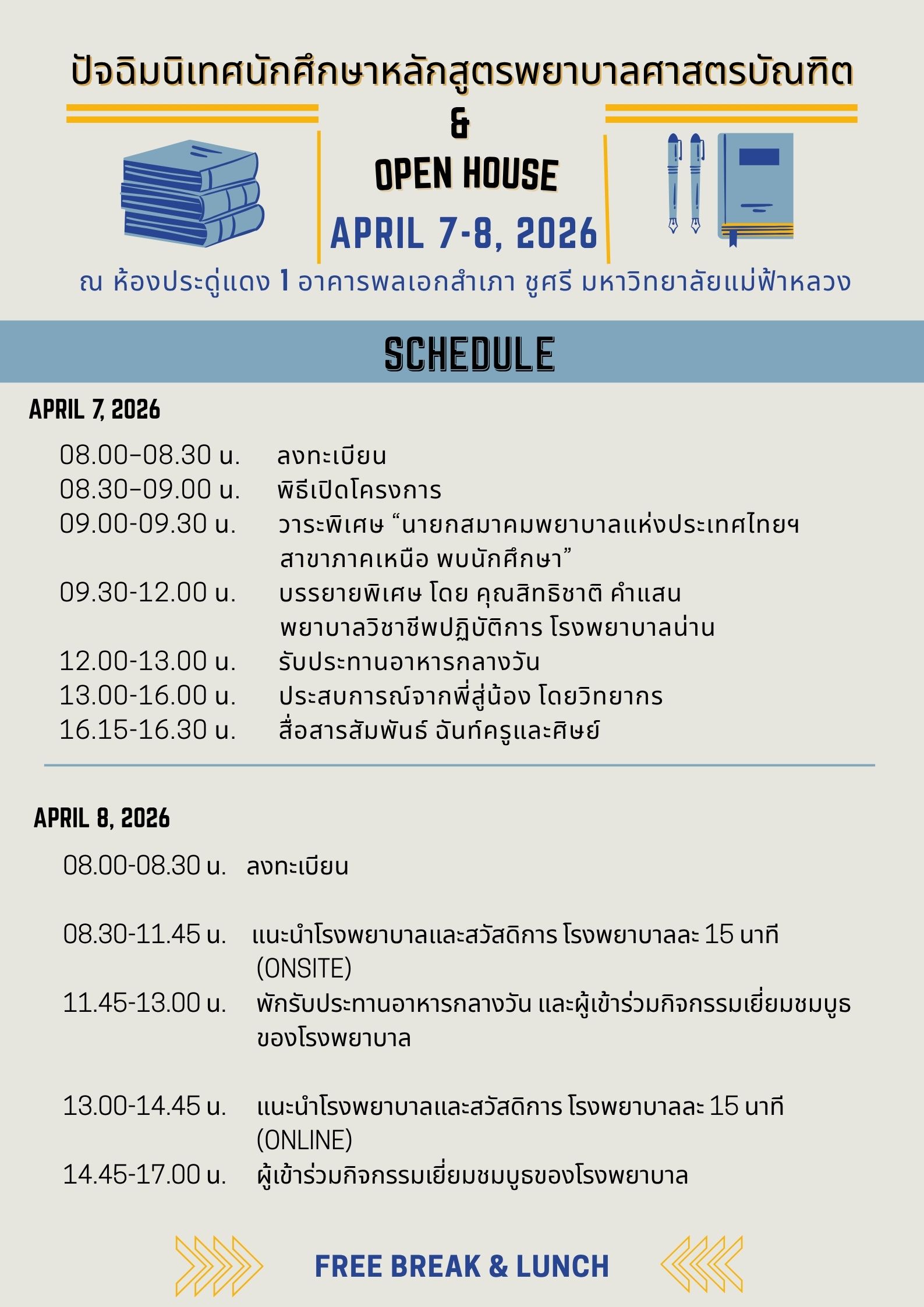สำหรับวันที่ 8 เมษายน 2569 เป็นกิจกรรม Open House เปิดโอกาสให้นักศึกษาได้พบกับตัวแทนจากหน่วยงานและโรงพยาบาลทั้งภาครัฐและเอกชนจำนวนมาก ทั้งในรูปแบบ onsite และ online เพื่อรับฟังข้อมูลเกี่ยวกับโอกาสการทำงาน สวัสดิการ และเส้นทางความก้าวหน้าในวิชาชีพ อีกทั้งยังมีการจัดบูธนิทรรศการจากโรงพยาบาลต่าง ๆ ให้ผู้เข้าร่วมได้เยี่ยมชมและสอบถามข้อมูลโดยตรง