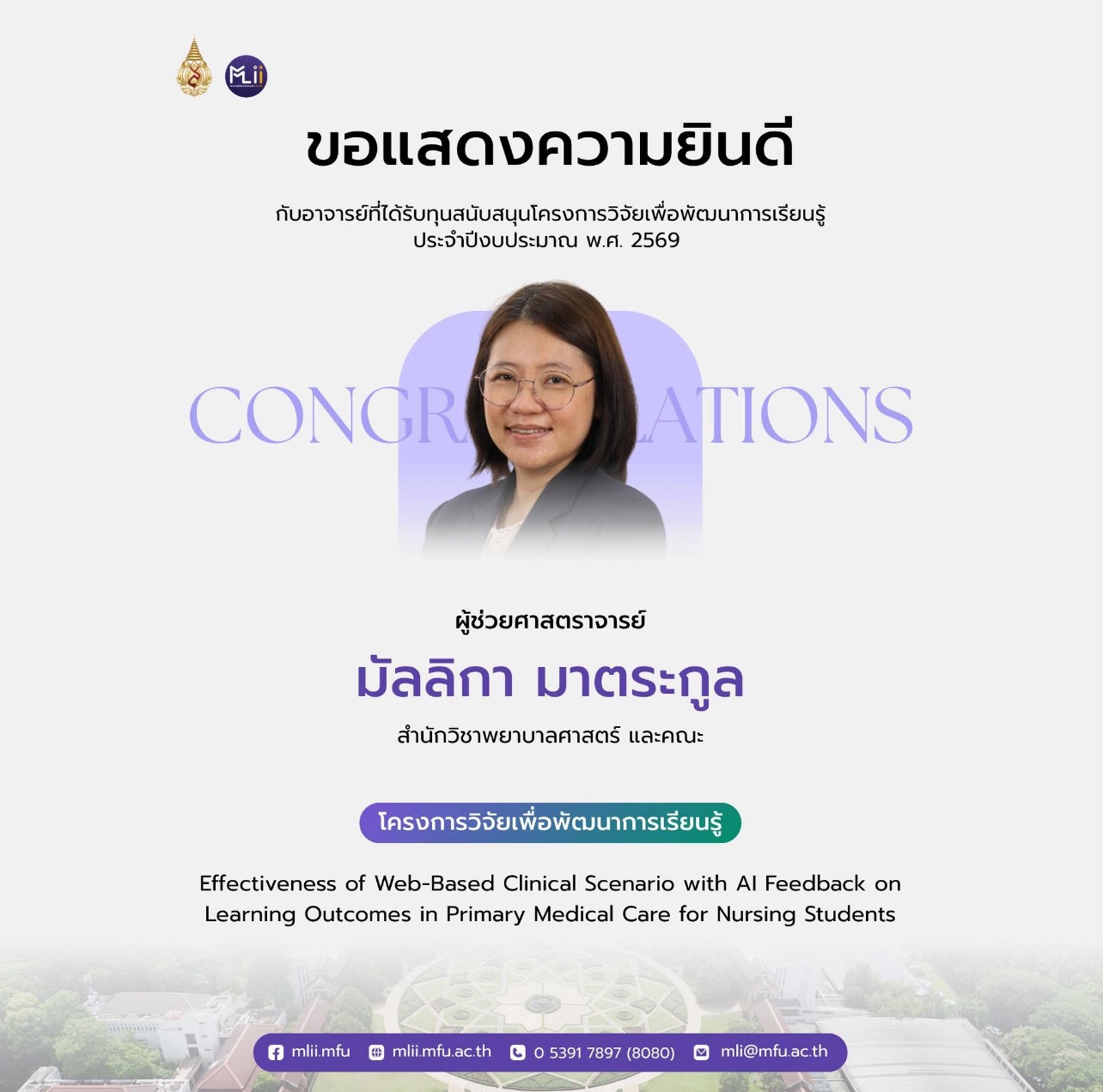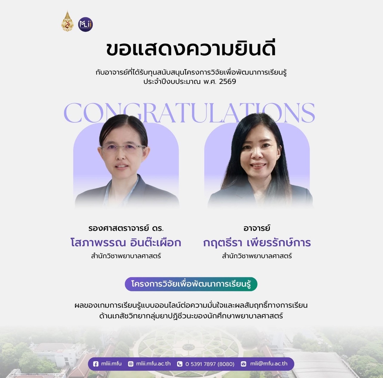 The School of Nursing, Mae Fah Luang University, proudly congratulates faculty members who have been awarded research grants for learning development for the fiscal year 2026: